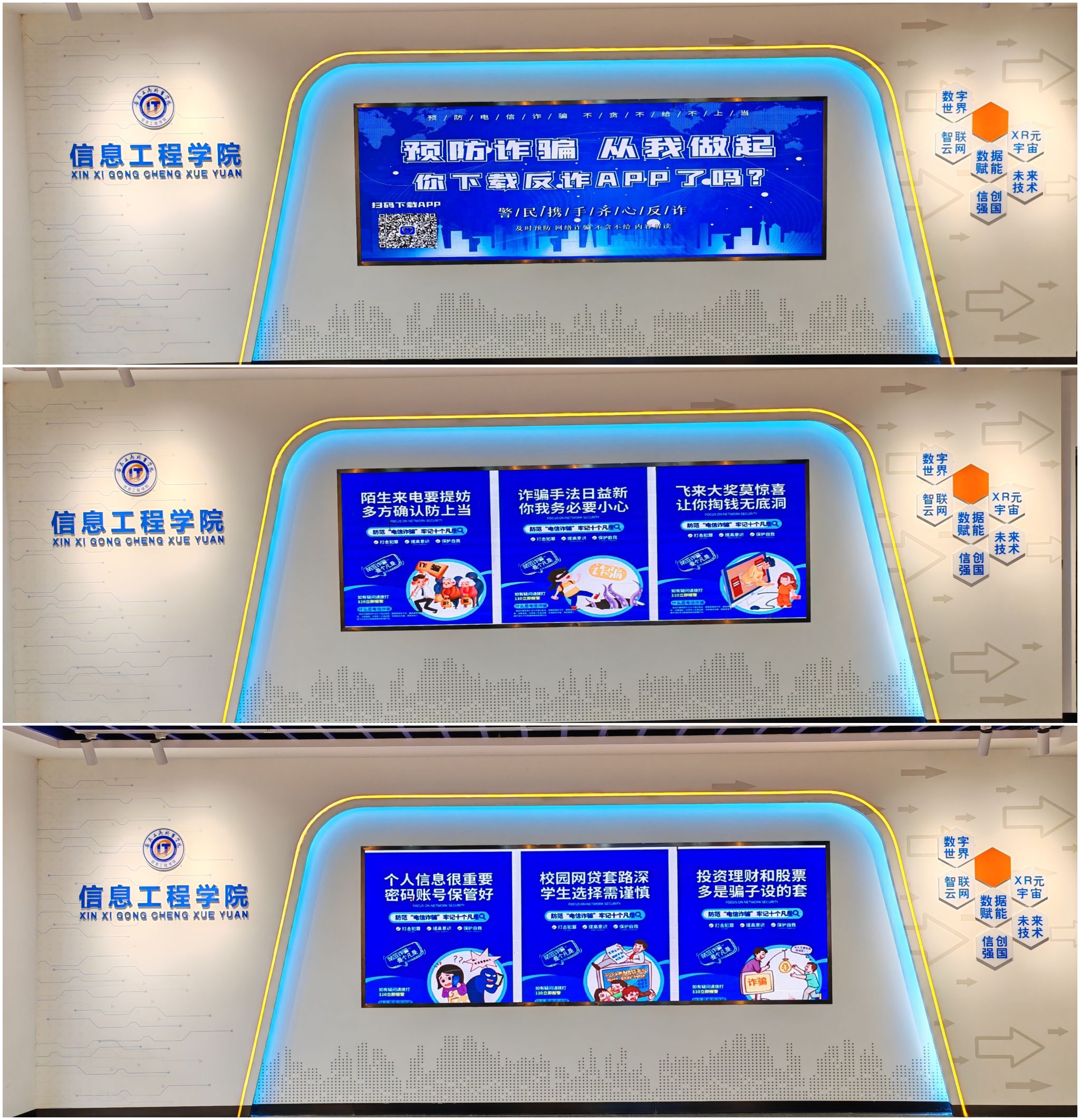 自学院召开反诈防骗专题部署会议以来,各班辅导员迅速行动,采取线下宣传与线上宣传相结合的方式开展全方位无死角的反诈宣传活动,围绕学校“反诈防骗 青春同行”开展安全教育主题班会,创新反诈防骗宣传形式,丰富宣传内容,将反诈防骗的主题会议从教室开到宿舍,反复叮嘱同学们收到陌生来电和信息时多份“心眼子”;专业课老师利用课堂教学契机穿插网络诈骗案例,从网络信息安全角度提醒同学守好“钱袋子”。学院还充分利用三微一端宣传媒介打通反诈教育最后一公里,例如各楼层宣传电子屏滚动播放反诈防骗宣传素材,学院微信公众号定期推送诈骗典型案例,学生社团录制“防范电信网络诈骗你如何看待”微视频等各种媒体宣传方式;新生入学以来,各班组织签署反诈承诺书,举办专题讲座、制作宣传海报、发放防范手册,让反诈宣传无处不在。