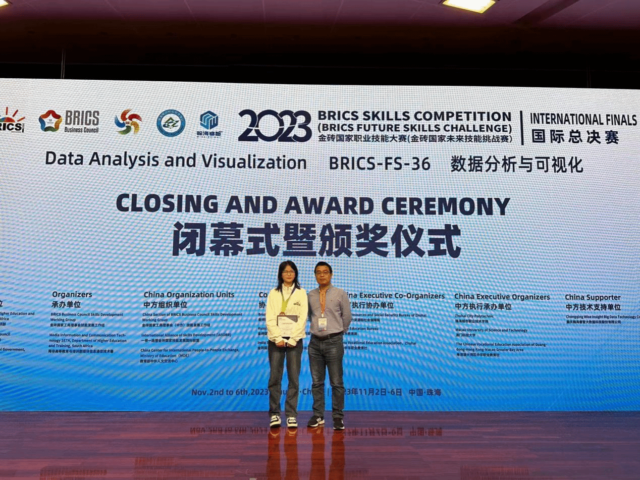 11月3日至6日,2023金砖国家职业技能大赛数据分析与可视化赛项国际总决赛在珠海城市职业技术学院举行,来自中国、南非、俄罗斯、印度、马来西亚、中国澳门等13个国家和地区的138支队伍经过2天的激励角逐,我校21人工智能技术班任莉同学以总分第三斩获铜牌、一等奖,指导老师胡贵恒获优秀指导专家称号。