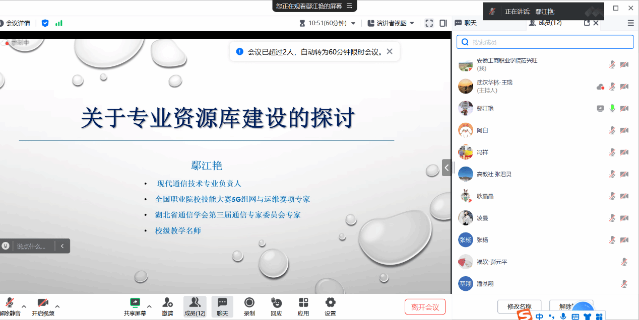 会议伊始,武汉铁路职业技术学院现代通信技术专业负责人鄢江艳教授发表了主题演讲。她从专业建设内容、专业资源库建设的意义、专业资源库建设的思路以及专业资源库建设实践探索四个方面进行了深入剖析。鄢教授指出,专业资源库的建设不仅有助于提升教学质量,还能促进教育教学改革,为我国培养更多高素质技术技能人才。