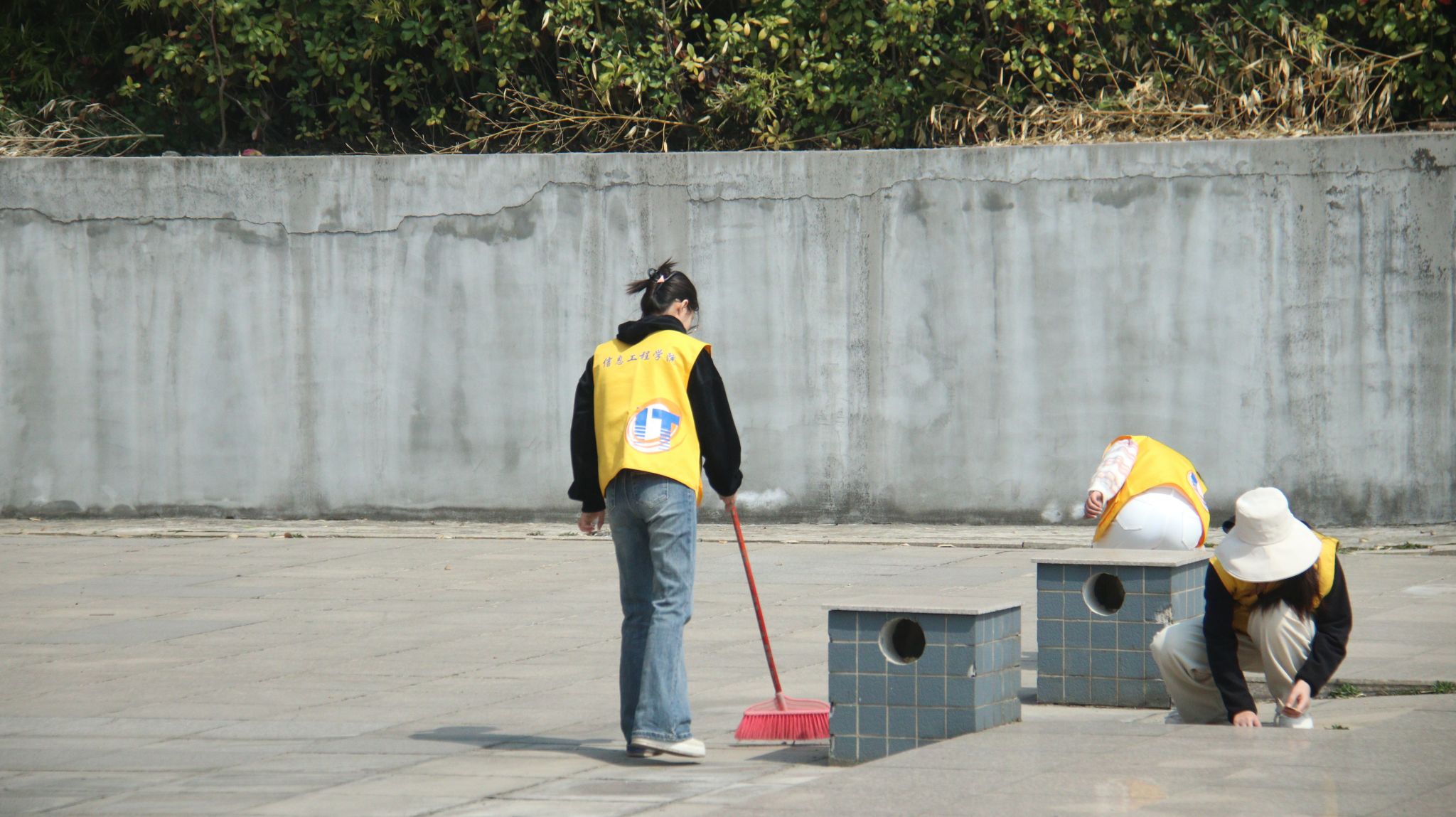 一件件黄色的小马甲精神饱满,热情洋溢,阳光向上,分成若干小组,手持扫帚、垃圾袋等深入校园的各个角落,同学们认真清扫道路、清理落叶、移除杂物……忙碌的黄马甲身影、温暖的春日绿色校园相映成趣。