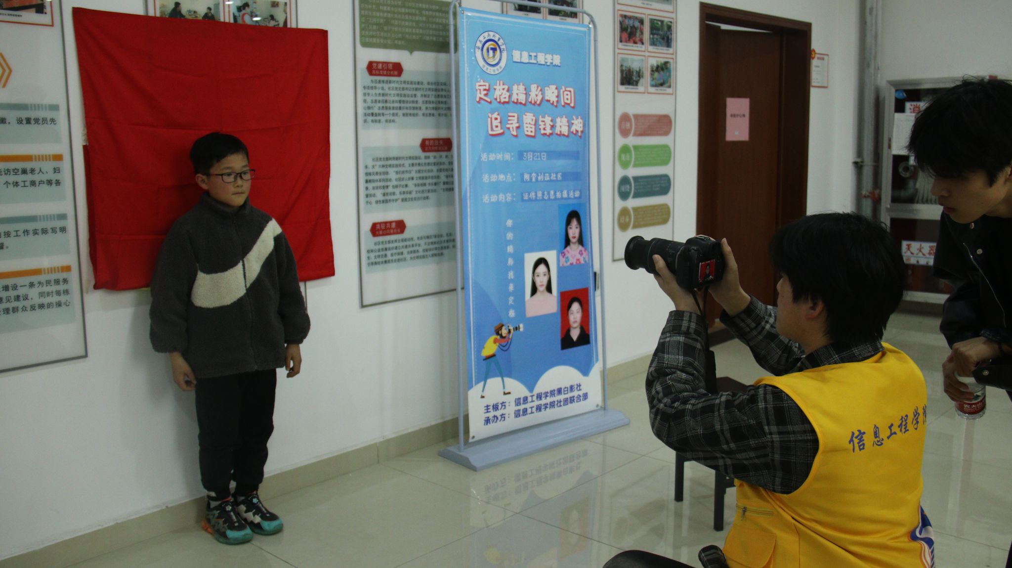 青春“证”好,“照”亮未来。黑白影社的志愿者们分工明确,协作同行,力求给居民拍摄出最美证件照。布景人员仔细搭建背景板,调整灯光,摄影师一边专业地调整相机一边耐心地提醒居民衣着整理以及表情管理,随着123口号的响起,志愿者用相机定格了居民们美好瞬间。