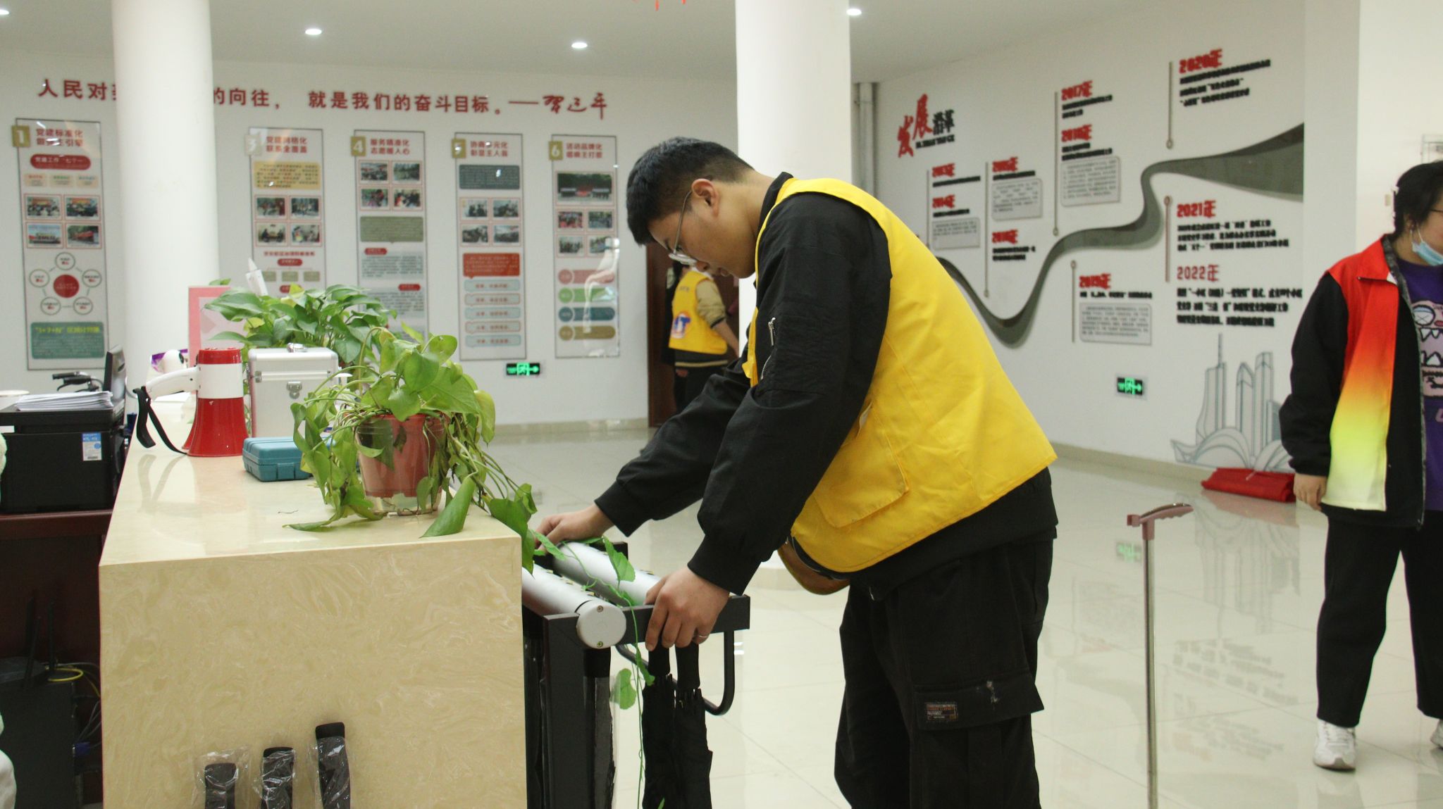 洁净家园 美化环境。生活部和体育部的志愿者们手拿抹布、拖把等清扫工具,分工协作,或擦洗宣传栏、座椅,或捡拾废弃物,齐心协力打扫社区活动室,清除卫生死角和盲区,使社区活动中心焕然一新。