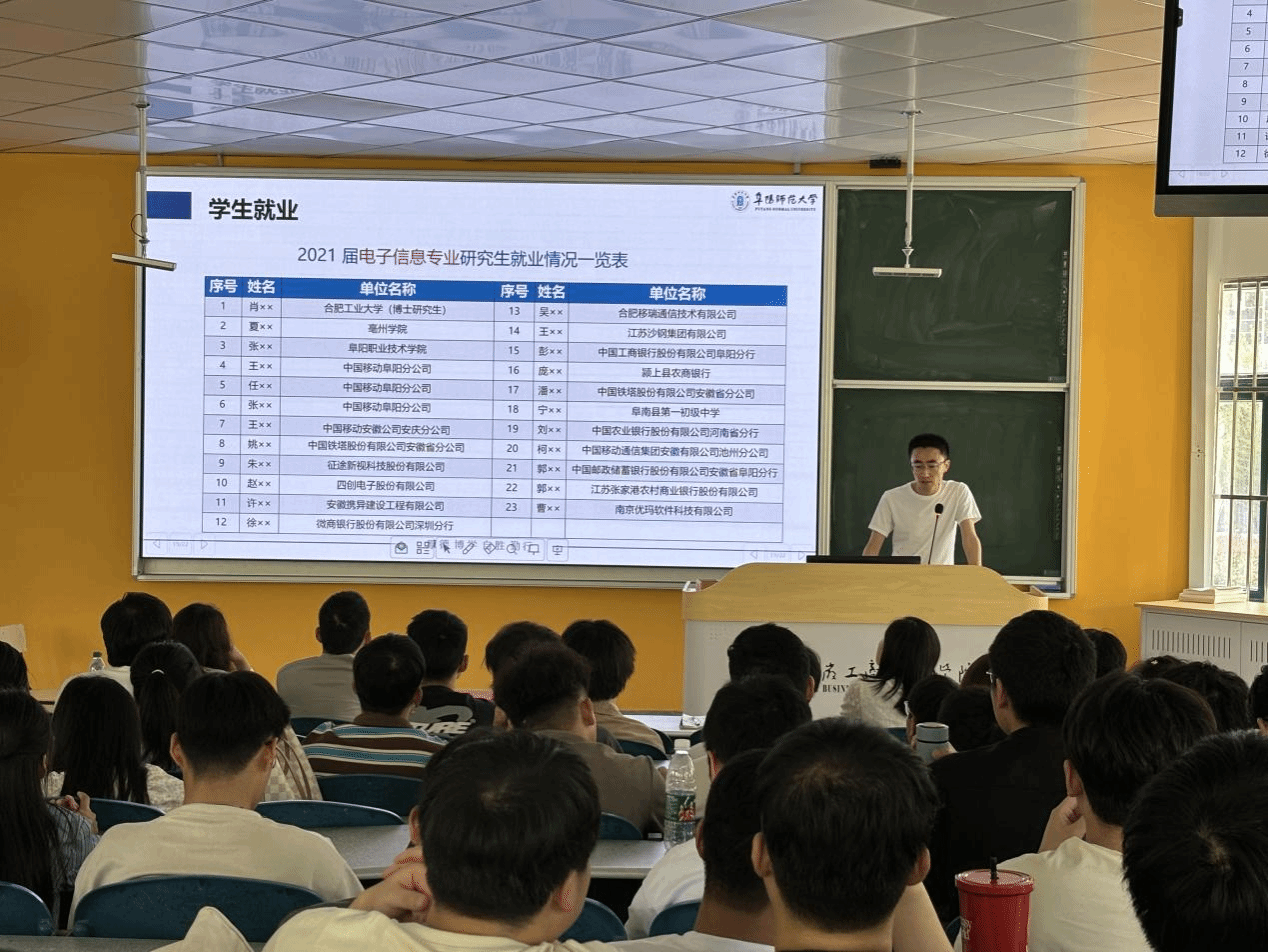 韩立国博士跟同学们介绍了阜阳师范大学计算机与信息工程学院的发展历程、师资团队、教学科研成果及实验设备等;韩博士重点分享了阜阳师范大学计算机与信息工程学院研究生考试的专业研究方向、初试及复试的考试科目以及研究生考试的参考教材及复试的成绩构成、专业测试和综合面试等;最后还介绍了阜阳师范大学计算机与信息工程学院相关专业研究生专业学制和培养方式及资助政策,部分毕业生发表的论文成果和就业情况。