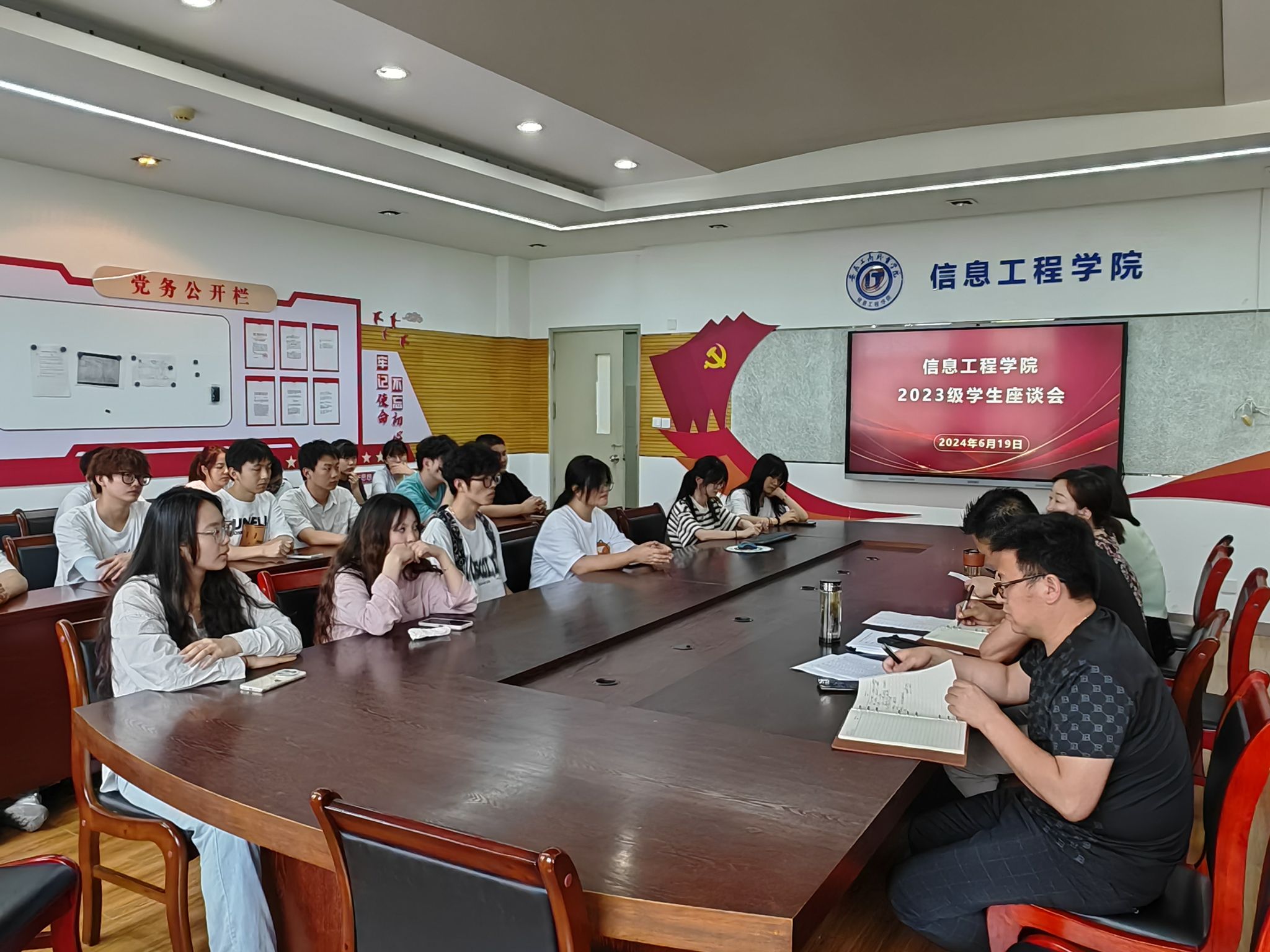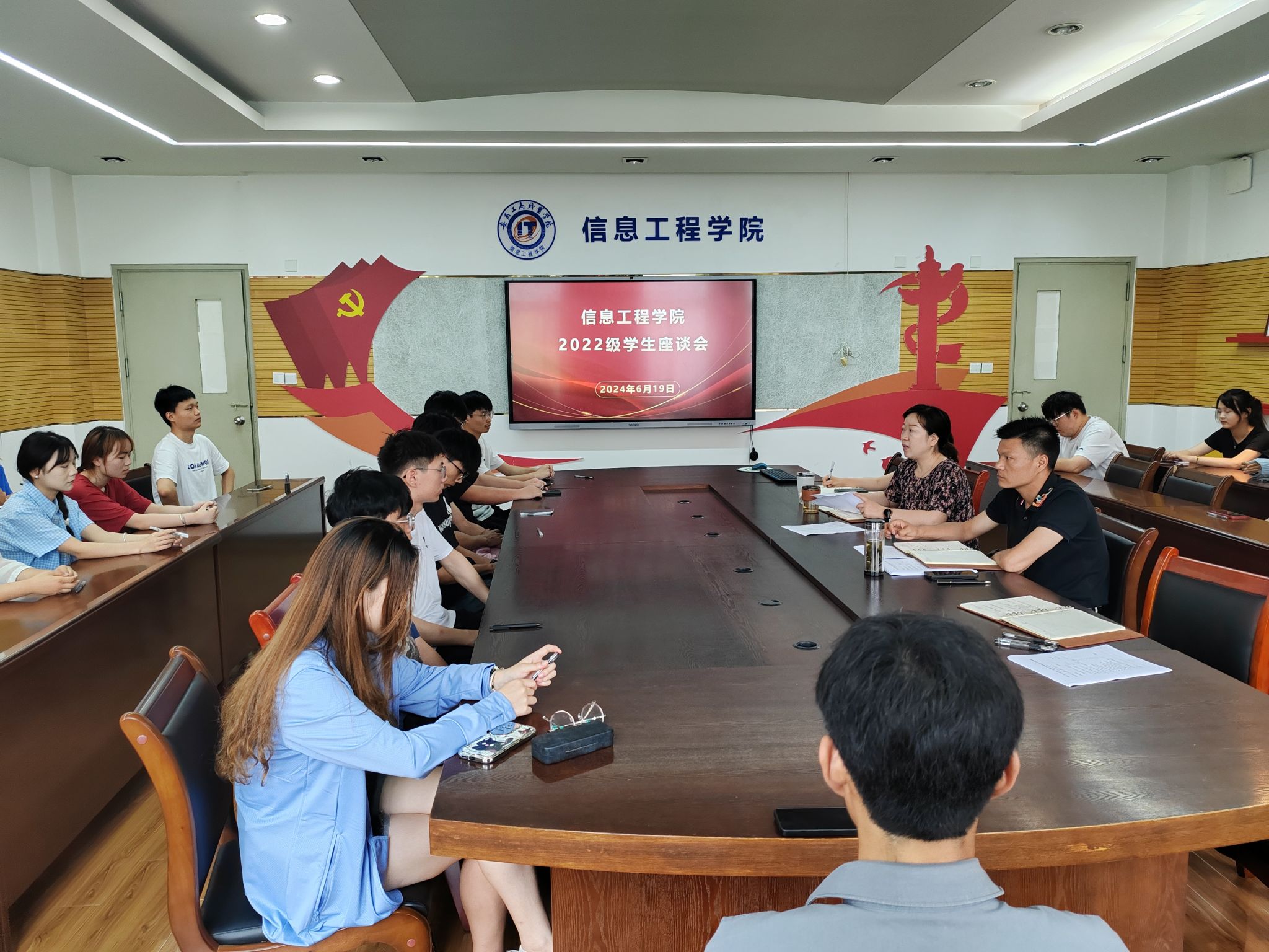 为进一步落实落细学院教学质量和学生教育管理服务工作,全面推进人才培养质量发展,6月19日下午,信息工程学院组织分别召开了22、23级学生代表座谈会,征集学生对教学和学生日常管理相关工作的意见和建议,解决学生在学习和日常生活中的“急难愁盼”问题,扎实开展“我为师生办实事”实践活动。信息工程学院教务科负责人、动漫党支部书记杨静主持会议,副院长黄梅娟、党总支副书记陈夺、办公室主任徐祥辉参加了会议。