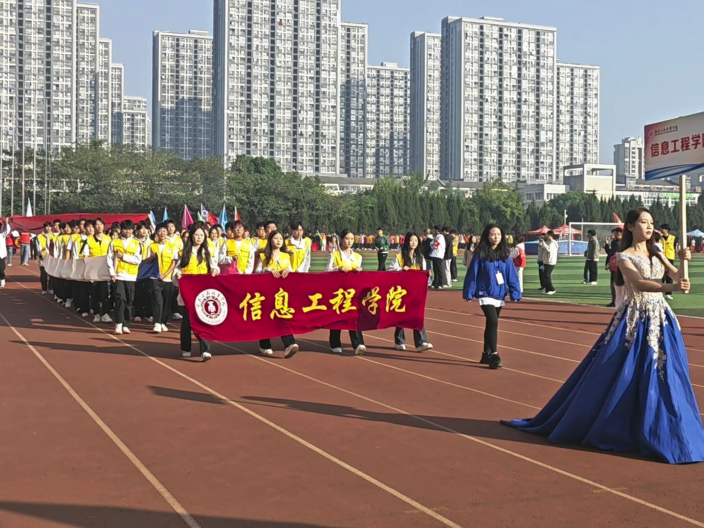 霜降至,秋意浓。2024年10月23、24日,我校举办了第二十届田径运动会,信息工程学院学子积极参与,顽强拼搏。开幕式上,信息工程学院代表队高举国旗与院旗、穿过彩带交织成“AI”的方阵,以昂扬的姿态展现信工学子们在运动场上的风姿与团队合作精神,以热情饱满的姿态迎接运动会到来。