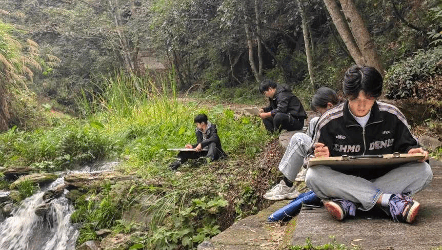 在胡多军书记的带领下,师生团队考察了村里附近的九井溪、龙潭谷、仙人瀑布等著名景区。面对如此美景,同学们纷纷拿出画笔和手机,不仅用手中的画笔描绘着眼前的美景,也通过手机镜头记录下了大龙村独特的自然风光。