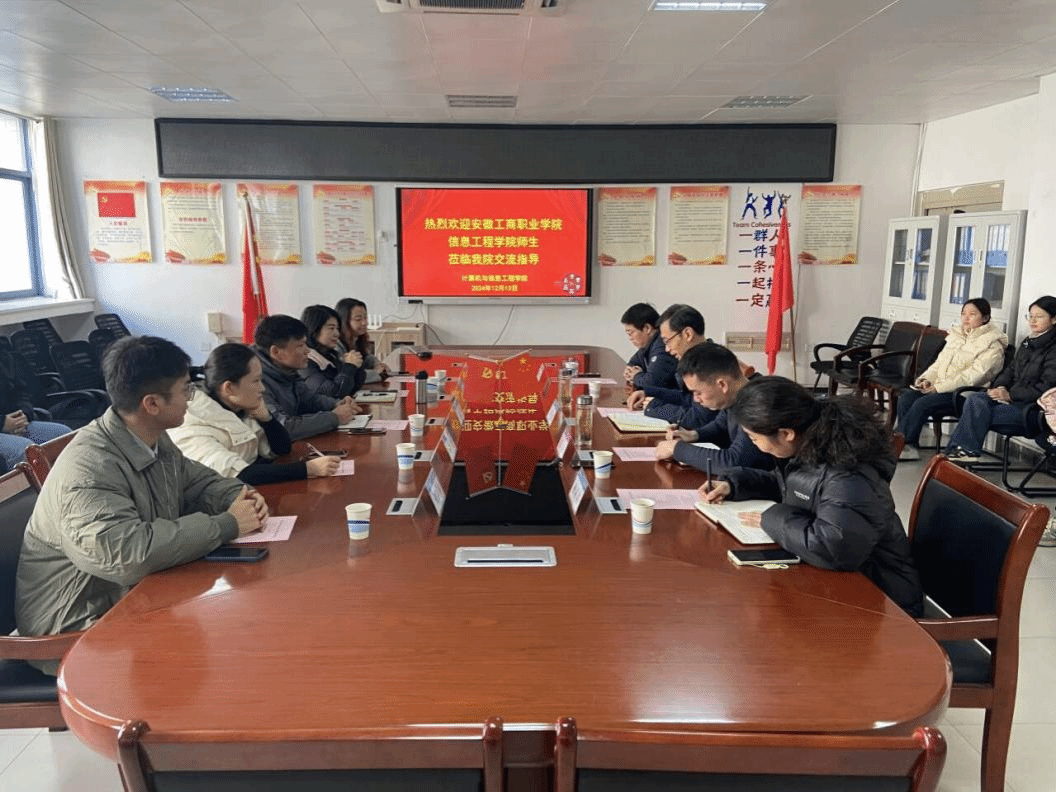 2024 年 12 月 13 日,信息工程学院党总支副书记陈夺带队前往阜阳师范大学计算机与信息工程学院开展调研交流活动。软件技术教研室陈翠红、尹金老师,软件工程(专升本)专业辅导员凌曼、商海军老师以及 2023 级、2024 级软件工程(专升本)专业 9 名学生代表一同参加。阜阳师范大学计算机与信息工程学院党委副书记刘杰、软件工程专业负责人赵佳主任等给予了热情接待。