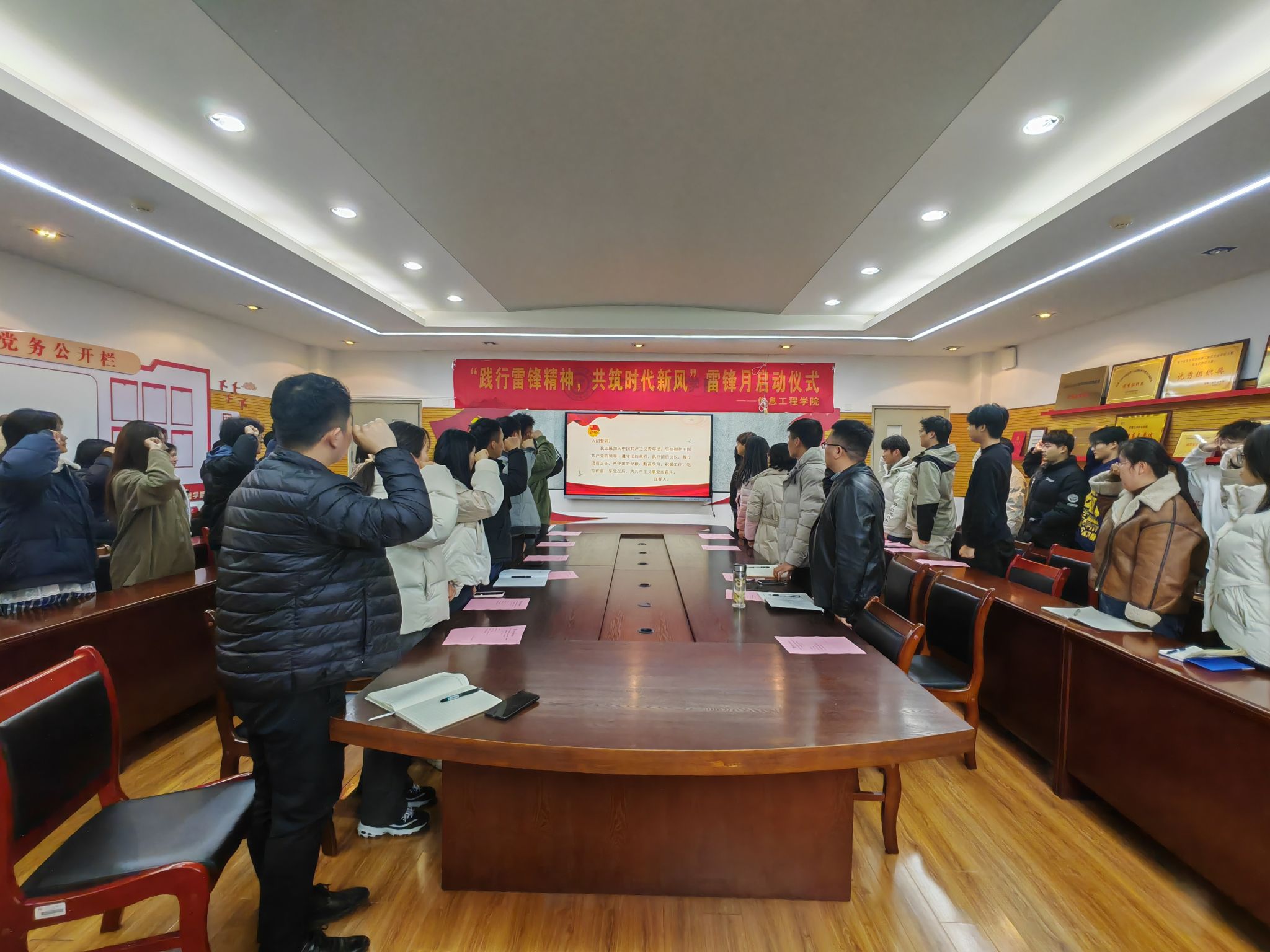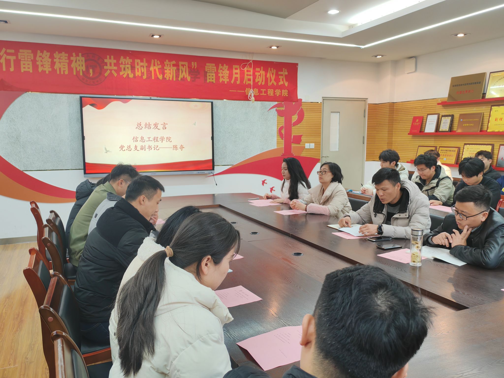 为弘扬雷锋精神,增强新时代大学生的社会责任感,进一步推动学院学雷锋志愿服务活动常态化、制度化,掀起全院学雷锋志愿服务活动热潮。3月3日中午,在全国第62个“学雷锋纪念日”来临之际,信息工程学院隆重举行了“践行雷锋精神,共筑时代新风”雷锋月主题系列活动启动仪式。信息工程学院党总支副书记陈夺、全体专职辅导员和部分团干参加了此次活动。