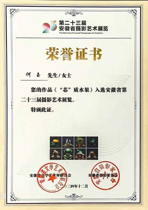 何玉老师的摄影作品兼具艺术价值与时代内涵,多幅作品在《人民日报》《央视网》《人民网》《安徽日报》《安徽商报》《合肥日报》等权威媒体发表。摄影作品入选安徽省文联主办的安徽省第二十三届摄影艺术展览,并在合柴1972文创园美术馆展出;获得安徽省摄协、庐阳区文联举办的"首善之区 光影庐阳"摄影大赛优秀奖;荣获安徽省文化和旅游厅、安徽省文化馆主办的安徽省"群文之星"艺术影像大赛最佳摄影奖(纪实类);平面作品在世界自然基金会主办的“我眼中的可再生能源”短视频及平面作品征集活动获优秀奖;作品入选安徽省摄影家协会主办的皖美视觉2024年摄影月赛(年味专题);荣获安徽省摄影家协会主办的皖美视觉2024年航拍摄影大赛年度总评优秀作品;荣获合肥市文联主办的"光影友好城"合肥儿童友好城市建设摄影大赛二等奖;获得中共合肥市委宣传部、合肥市科学技术协会主办的2024合肥科技文化摄影大赛优秀奖;作品还先后入选江苏省文联主办的2024江苏省科普摄影大赛和深圳市文联主办的第十届深圳摄影作品年度展。这些摄影作品用影像记录了地方能源结构转型的绿色实践,定格了现代农业发展的蓬勃生机,展现了合肥科技创新的硬核实力,描绘了城市形象建设的精彩画卷,更以AIGC创新呈现了合肥在“芯屏汽合”方面新质生产力的发展。这些充分展现了何玉老师精湛的专业技艺和深厚的艺术造诣。