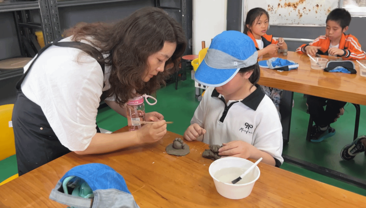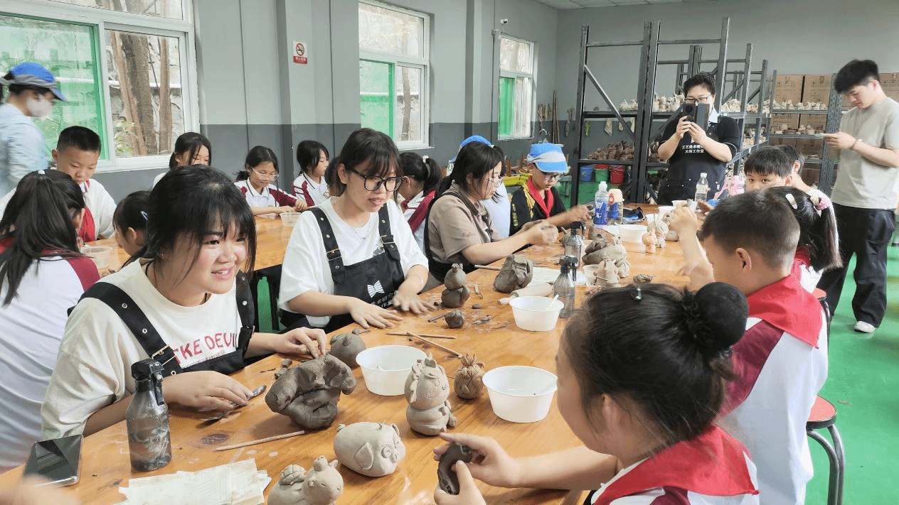 安徽省工艺美术大师、信息工程学院关工委常务副主任杨帆教授亲临现场,以其深厚的专业积淀和生动的讲述,为孩子们勾勒出陶瓷文化的历史脉络与制作工艺精髓,让孩子们在知识和传统技艺的滋养中,对陶瓷艺术心生向往。信息工程学院动漫制作技术教研室党支部书记杨静率学生团队积极践行“技艺传承计划”,带领孩子们参观了陶瓷实训室中动漫专业学生的优秀陶艺作品,悉心指导孩子们进行陶瓷捏塑体验。结合他们喜闻乐见的动漫卡通造型,从揉泥的手法到塑形的技巧,耐心细致,倾囊相授。孩子们手中的陶泥幻化成一个个充满童趣的创意作品,现场洋溢着新奇、欢乐的氛围。