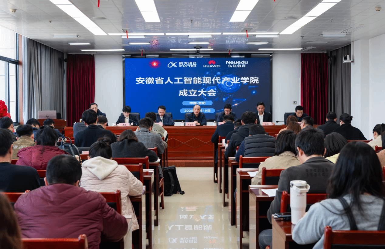 2025年3月19日,安徽工商职业学院省级人工智能现代产业学院正式揭牌成立。该学院由校企四方共建,旨在构建“教育链、人才链、产业链、创新链”四链融合的协同育人体系,现场与科大讯飞、华为、东软教育签订合作协议,并获企业捐赠教学设备。安徽工商职业学院党委书记齐建平、高校毕业生就业协会职业教育工委会学术副主任王晓斐、科大讯飞股份有限公司工业智能研究院副院长李寅、华为技术有限公司安徽政企教育医疗业务部总经理高彪、东软教育科技集团有限公司职业教育事业部副总经理惠慧等出席会议,相关企业代表、教师代表70余人见证成立仪式。安徽工商职业学院党委委员、副院长陈章奇主持会议。