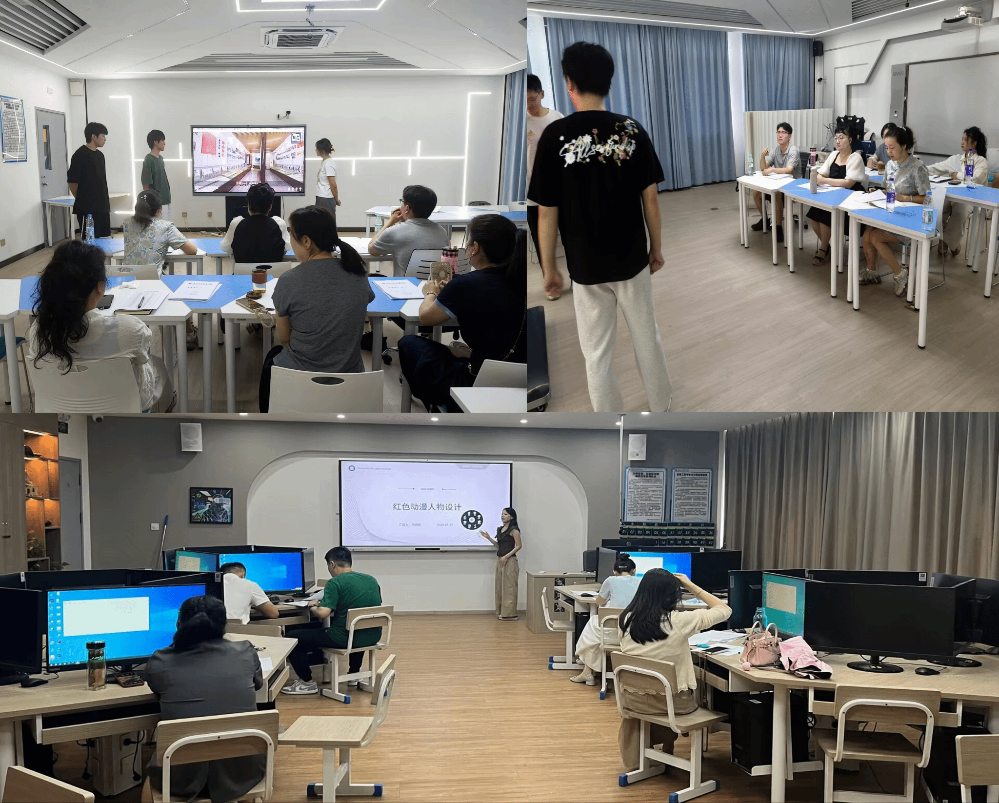 2025 年 7 月 25 日,动漫制作技术教研室 2026 届学生毕业设计答辩暨“红色数说”第二季活动在信息工程学院动漫制作技术 405、407 实训室顺利开展。本次活动有动漫制作技术、虚拟现实技术应用 2 个专业共 109 名学生参与,分为 2 组同时进行。其中,答辩一组由卢明慧担任组长,康文慧、张迎春等 6 位老师担任评委;二组则由郑群老师牵头,黄梅娟、杨静等 6 位老师组成评委团。