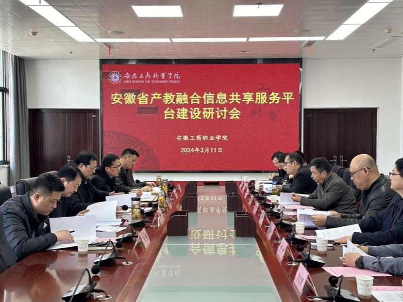 为深入贯彻落实《教育部安徽省人民政府关于整省推进职业教育一体化高质量发展加快技能安徽建设的意见》精神,加快推进安徽省产教融合信息共享服务平台建设,3月11日下午,在我校综合楼三号会议室召开安徽省产教融合信息共享服务平台建设研讨会。我校作为牵头建设单位,邀请了安徽财贸职业技术学院、安徽交通职业技术学院、安徽国际商务职业学院、安徽城市管理职业学院等兄弟院校教务处、信息中心相关部门负责人,以及部分企业代表参加研讨,院党委委员、副院长陈章奇,信息工程学院院长范生万、信息化建设与发展处处长余丙炎、教务处处长张震参加会议。会议由院党委委员、发展规划与质量管理处处长朱小龙主持。