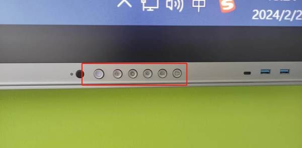按键从左至右依次为:电源按键、护眼模式、设置按键、音量减小、音量增加、录制