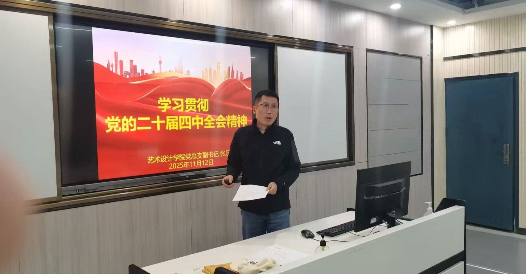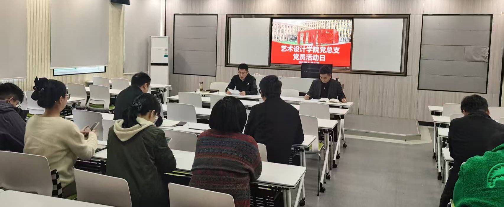 11月12日中午,艺术设计学院党总支在致知楼204智慧教室组织开展学习贯彻党的二十届四中全会精神主题党日活动,艺术设计学院党总支副书记张乐、副院长邱志斌等教职工党员参加活动。