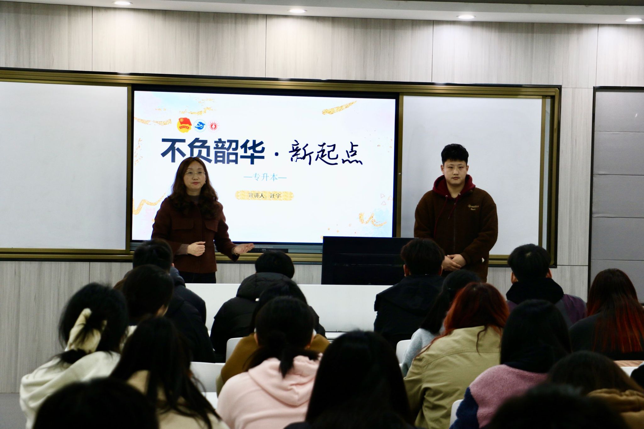 4月14日晚,艺术设计学院在庐阳校区致知楼二楼204智慧教室举办“优秀学子母校行”---优秀毕业生专升本求学分享会。本次特邀2019届产品艺术设计专业毕业生汪宇以“不负韶华.新起点”为题,为学弟学妹开展专升本心得分享会,来自我院22级、23级七十余名同学听取了报告。分享会由艺术设计学院团总支书记赵文卿主持。