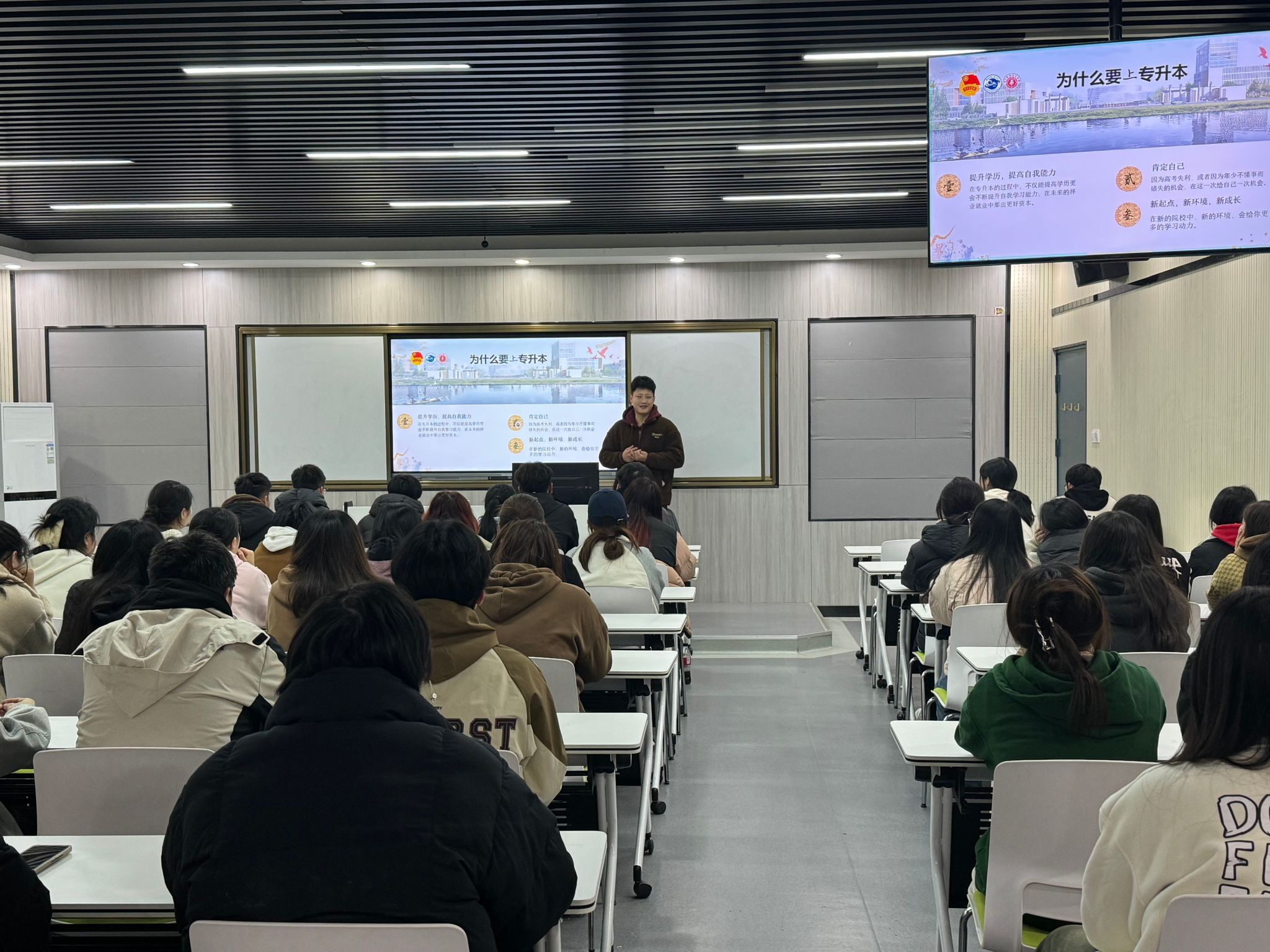 分享会上,汪宇从为什么要专升本、专升本的形式、专升本途径以及专升本的过程等四个方面和学弟学妹进行了分享,为有专升本意向的同学提供了耐心的指导。汪宇还结合自身实际,分享了自己从青春校园到投身国防再到继续求学深造的心路历程,详细解读了大学生应征入伍的条件、优待政策特别是学历提升的专属优待政策。他希望学弟学妹们珍惜当下,把握机会,树立自己的目标,规划好自己的未来。志成大才,行胜于言,坚定不移的朝自己的人生目标前行。汪宇还分享了南京信息工程大学的视频资料,优美的校园环境、浓厚的学习氛围,激发了同学们的向学之心。