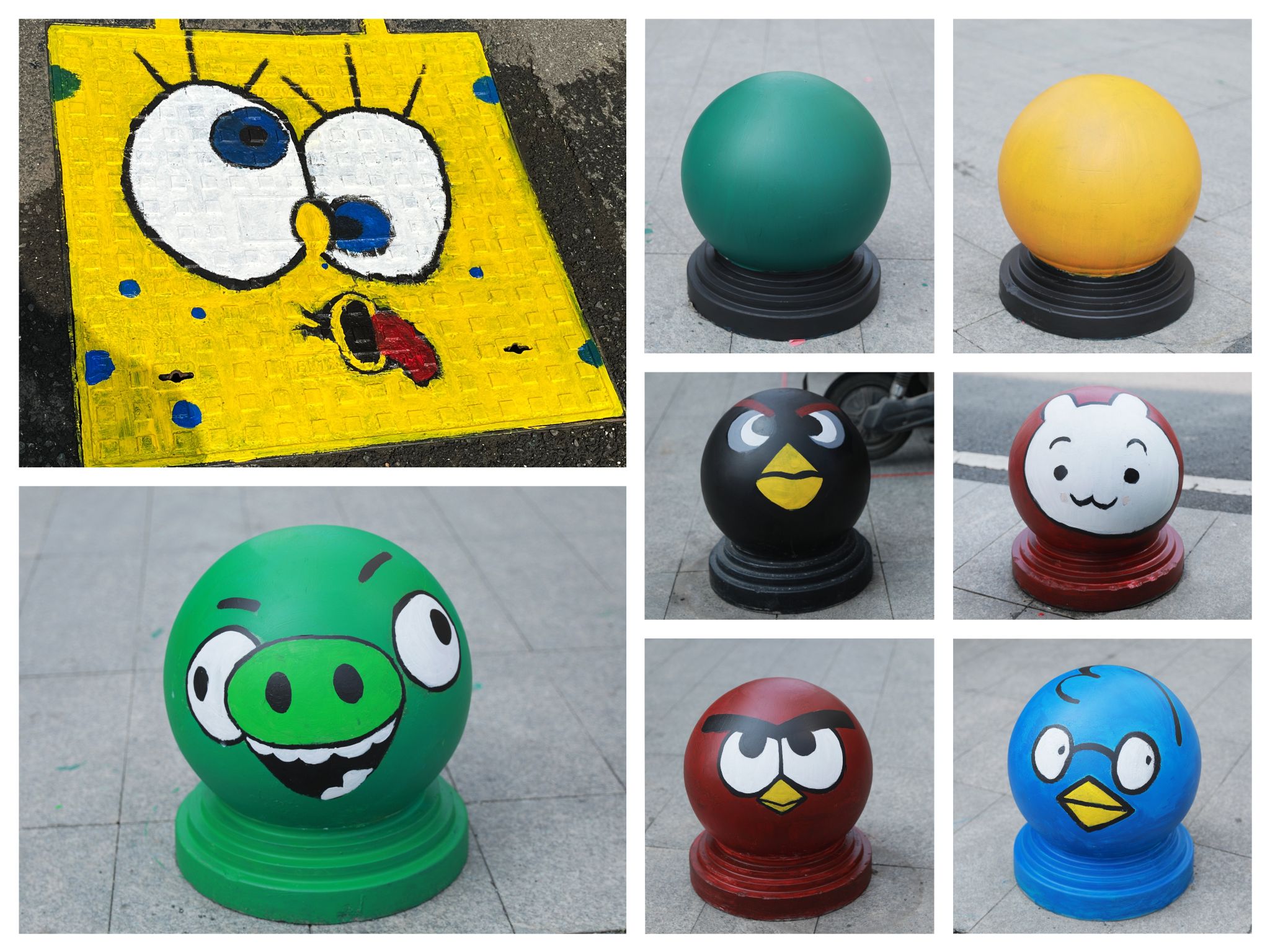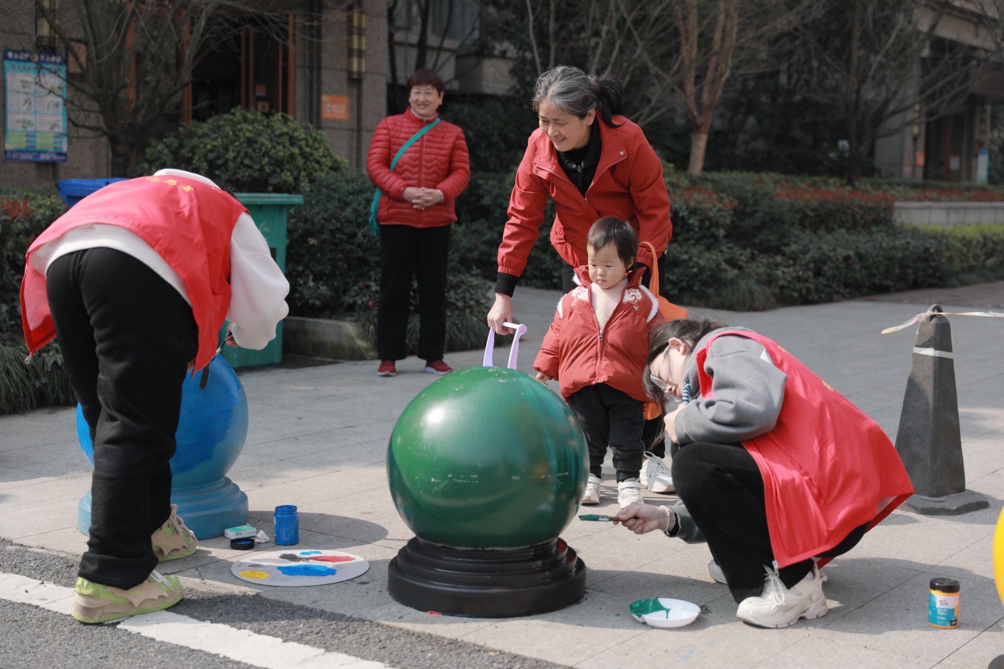 彩笔寄情,“井”上添花。在温暖的阳光下,同学们手持画笔,在调色盘中调出五彩的颜色,以石球、井盖为“画纸”,经过勾轮廓、刷底色、填色、修边等程序,绘制出了各色图案、花纹。每个环节都一丝不苟,一笔一画挥笔描墨,才思泉涌尽显井上。图样虽小,景致无穷。同学们绘制的过程中,许多居民带着孩子前来围观,感受艺术之美。经过志愿者的努力,原本平平无奇的石球和锈迹斑斑的井盖全都穿上了可爱是卡通“外衣”,焕然一新,成为了弘阳时光里小区春日里的新“井”色!