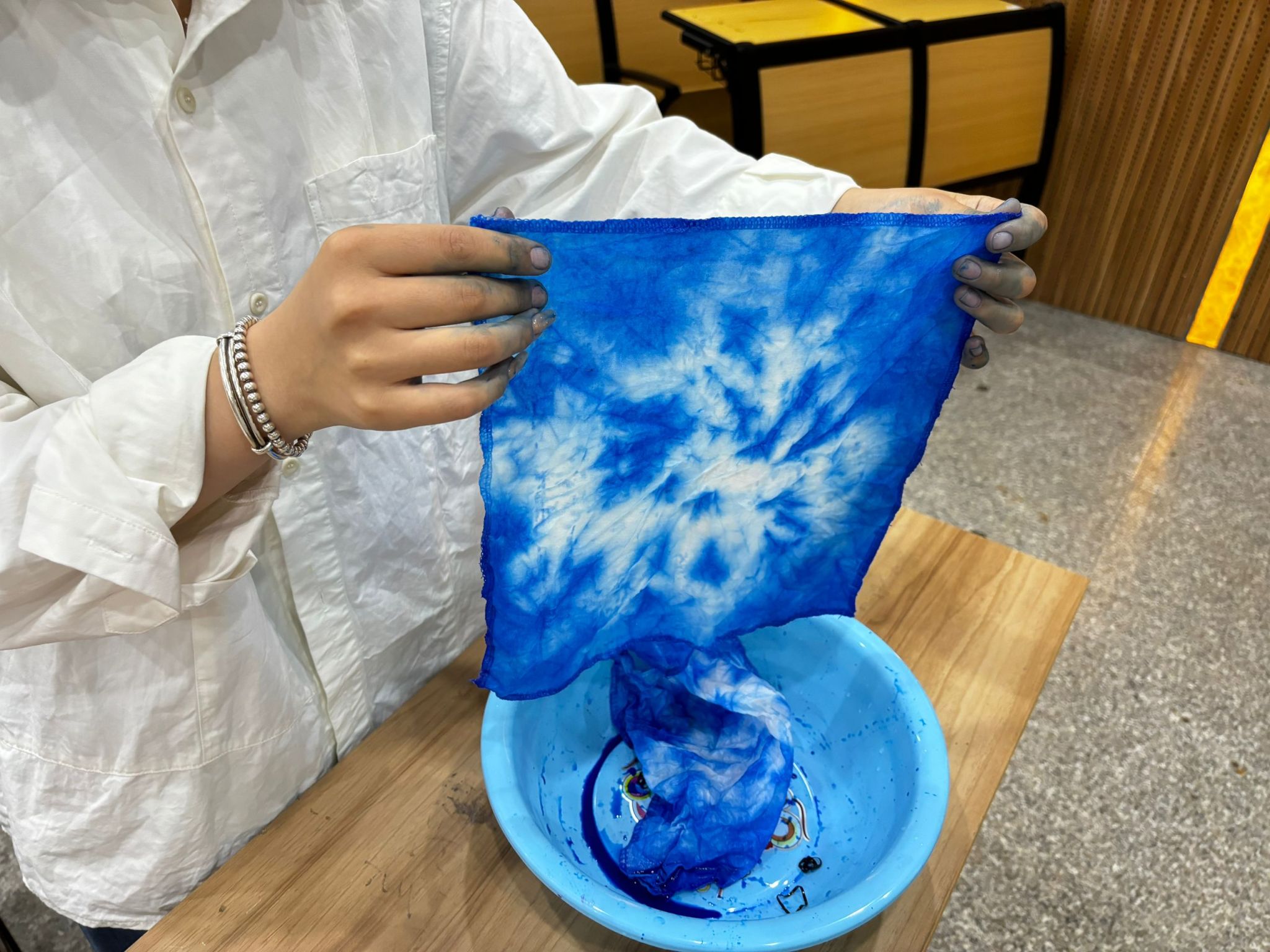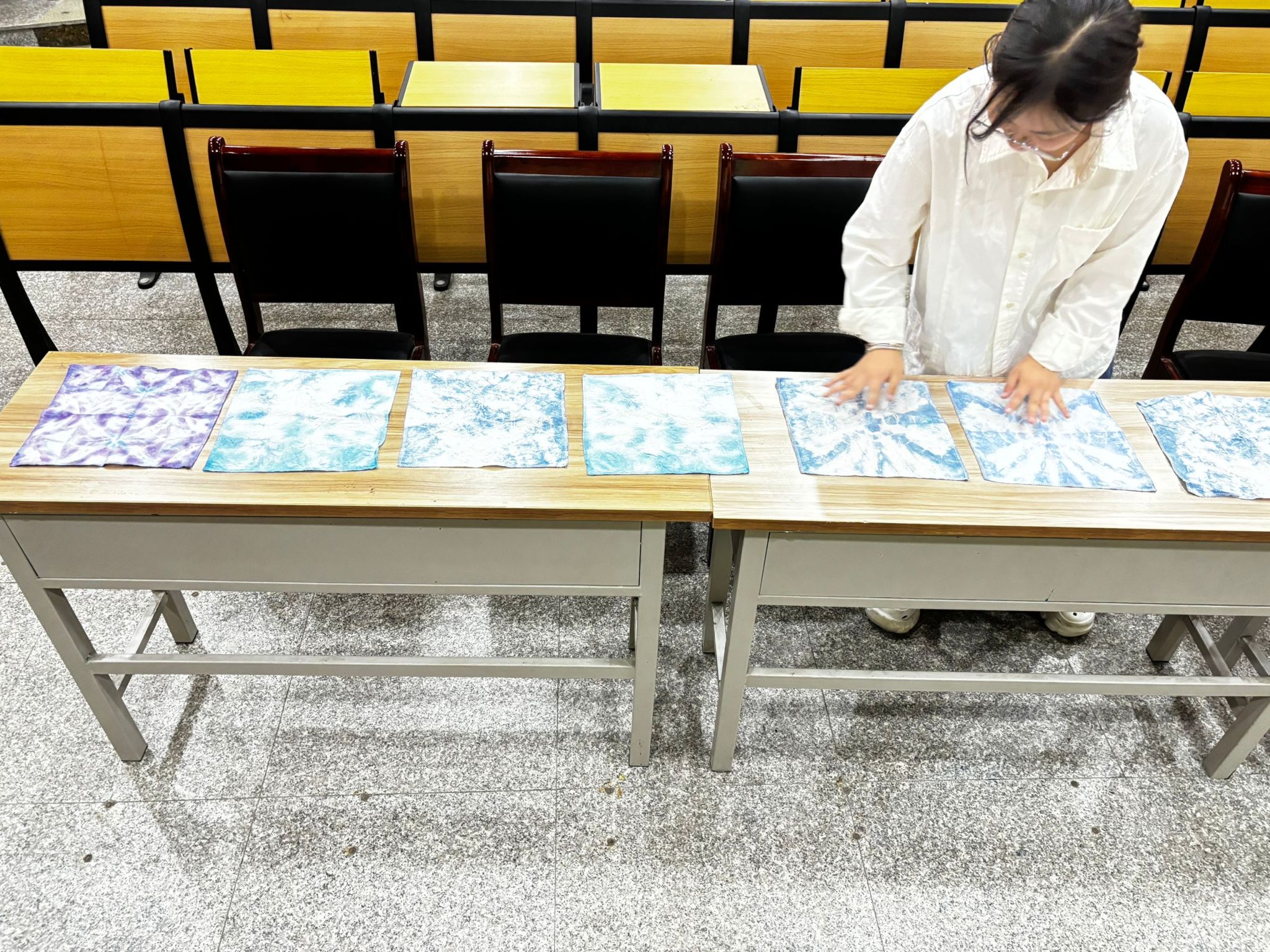 活动现场,志愿者们展示了自己精心制作的扎染作品,并借助图文影音资料,向参与的同学们详细介绍了扎染的起源,发展和工艺特点等有关知识。同学们在志愿者的指导下,借助自己灵巧的双手和独特的创意,将布料的色彩分布与纹理走向巧妙地融合起来,从染料的调配到布料的折叠再到扎捆,每一个环节无不体现了匠心独运。当望着一块块白色方巾经过浸染,逐渐显现出层次分明的靛蓝纹样,师生们充分体会到扎染的精妙和乐趣,现场充满欢声笑语,气氛十分热烈。
