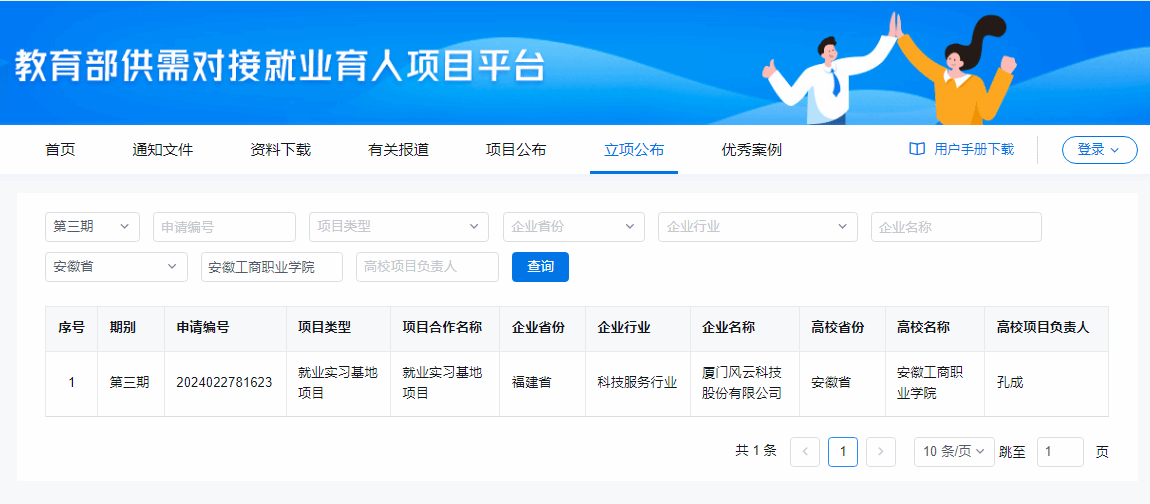 6月14日,教育部高校学生司发布《关于公布教育部第三期供需对接就业育人项目立项名单的通知》(教就业司函〔2024〕23号),由我校艺术设计学院孔成及团队申报与厦门风云科技股份有限公司共建就业实习基地项目正式获批立项。