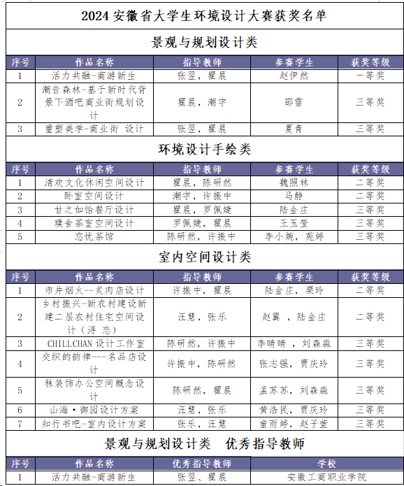 2024安徽省大学生环境设计大赛旨在通过比赛提升大学生的创新能力和实践能力,发现和培养设计领域的高素质专业人才。此次获奖,展现了学院学生较为扎实的实践能力和勇于探索新学科知识的创新精神,体现了对学生技能培养的重视。通过以赛促教、以赛代练,在指导教师的精心指导下,参赛学生学有所得、学有所获,同时,激发了相关专业学生的学习创作热情,锻炼了学生设计实践能力。(撰稿张翌,审核邱志斌)