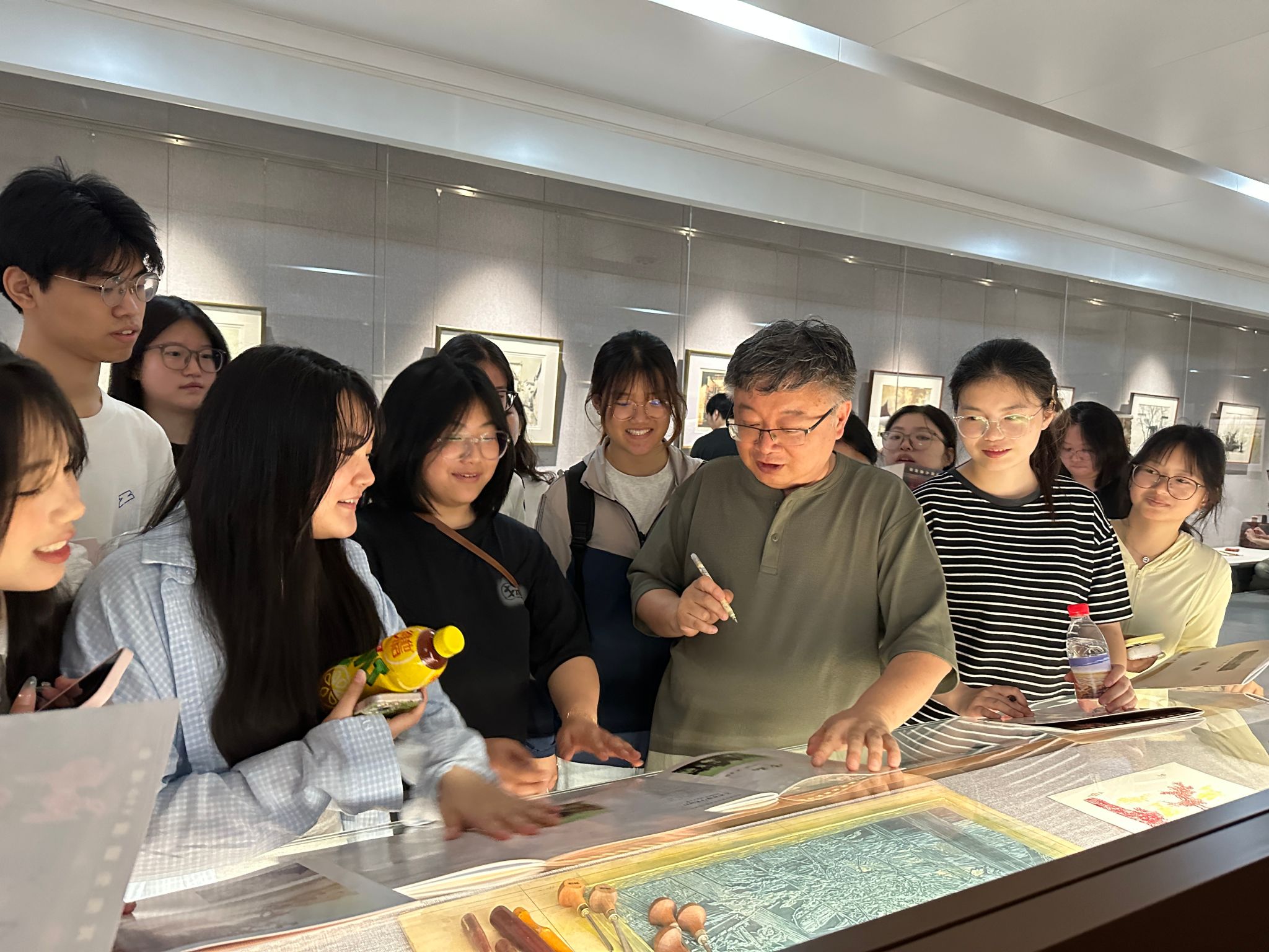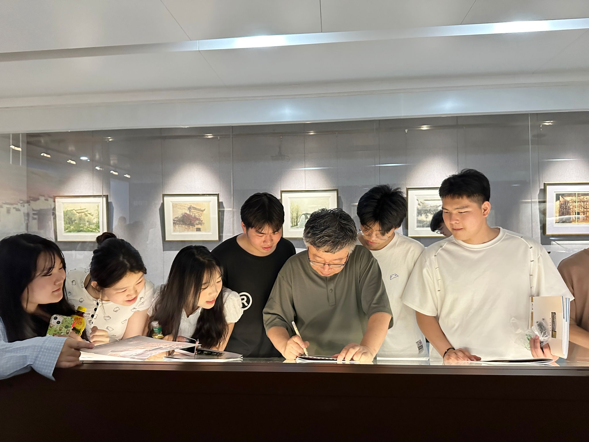 展览中,《黄山胜景》《徽州古韵》等作品吸引了师生驻足。同学们围绕“传统艺术的当代转化”与师晶老师展开讨论,提出关于设计语言与传统文化结合的问题,师晶老师一一解答,并鼓励学生:“徽派艺术的传承不仅是技法的学习,更是文化精神的延续。”活动尾声,师晶老师为同学们签名留言、合影留念,现场气氛热烈。同学们表示,此次观展不仅拓宽了专业视野,更增强了对本土文化的认同感与创作热情。