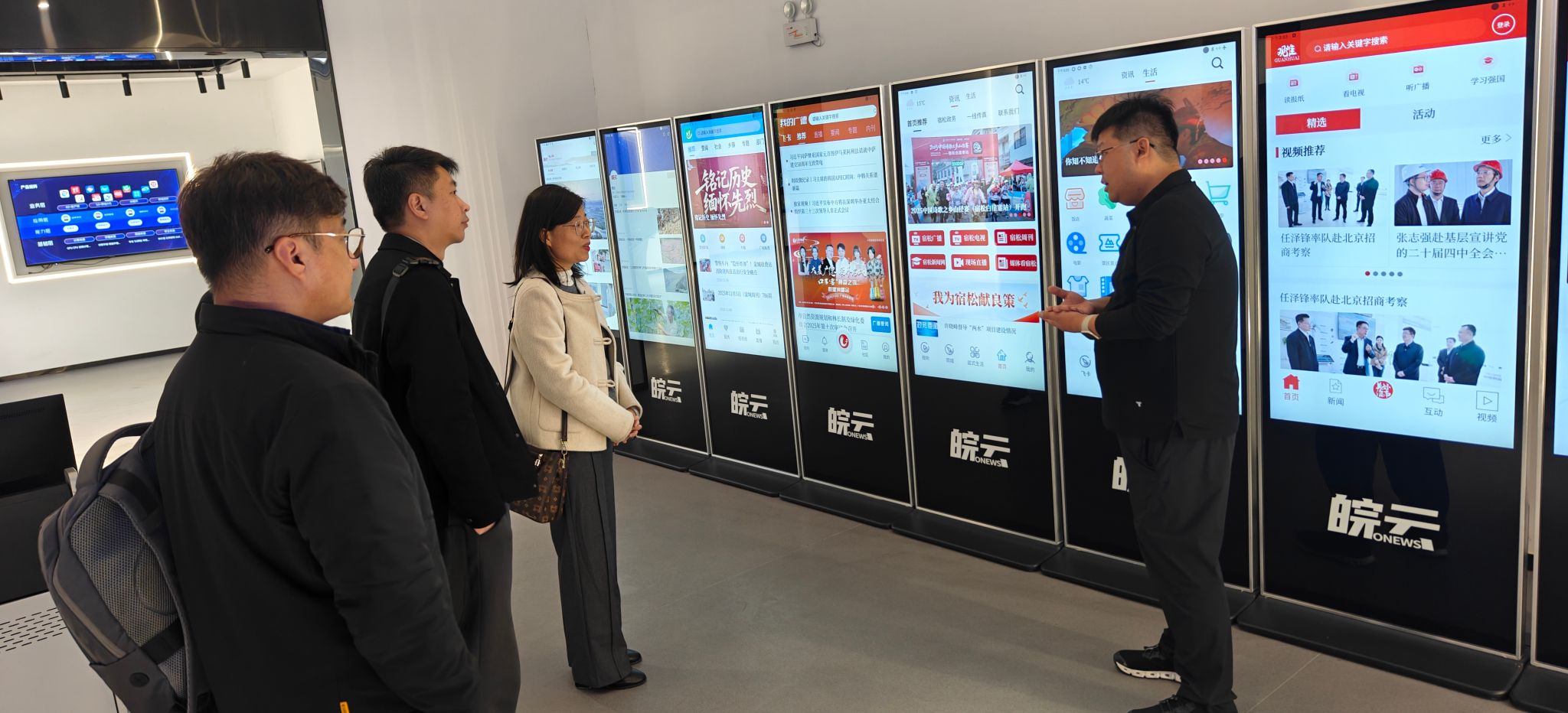 安徽皖云传媒科技股份有限公司总经理黄铮对艺术设计学院一行表示热烈欢迎,并陪同参观了企业展厅。参观过程中,黄铮详细介绍了公司的发展历程、重点项目成果以及技术平台服务内容。