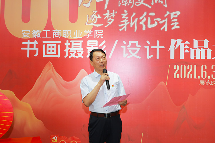 安徽工商职业学院党委书记孙永致开幕辞。首先,他代表学校向莅临开幕式的各位领导、嘉宾和朋友们的到来表示了热烈的欢迎;他强调,在庆祝中国共产党建党百年的重大时刻,举办本次展览,从不同的年龄、不同的侧面、不同的角度,以不同的方式和不同的艺术构思生动展现了中国共产党百年奋斗的光辉历程,深切表达了师生爱党爱国的真挚情感,集中展现了“艰苦奋斗、团结协作、求真创新、追求卓越”的学校精神;希望在接下来的展览期间,能有更多的师生走进展厅,接受红色教育、传承红色基因、汲取智慧力量、担当时代使命,切实做到学党史、悟思想、办实事、开新局。