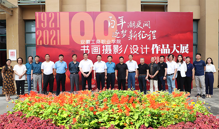 2021年6月30日上午9点30分,由安徽工商职业学院党委主办,校党委宣传统战部、校工会、校团委、艺术设计学院承办的“百年潮更阔·逐梦新征程”安徽工商职业学院庆祝中国共产党成立100周年师生书画摄影与设计作品大展在庐阳校区合瓦·VISION艺术馆隆重开幕。