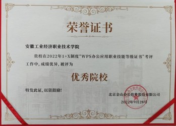 2022年9月,学院获评北京金山2022年WPS办公应用职业技能等级证书优秀院校,本次又获评安徽国产软件训练院2022年度WPS办公应用职业技能等级证书试点工作优秀组织院校,充分说明学院1+X“课证融通”人才培养模式实施规范,组织有力,效果良好。